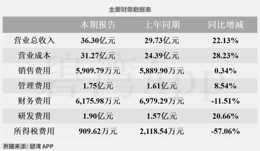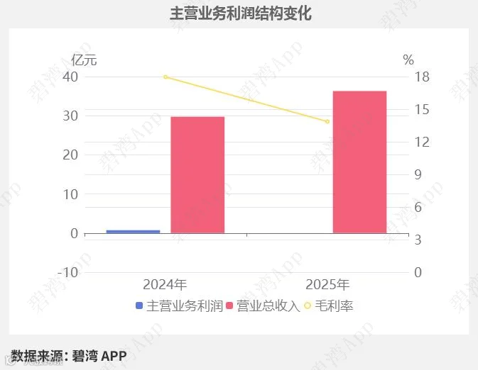 虽然营业总收入本期为36.30亿元,同比增长22.13%,不过毛利率本期为13.86%,同比下降了4.10%,导致主营业务利润由盈转亏。
