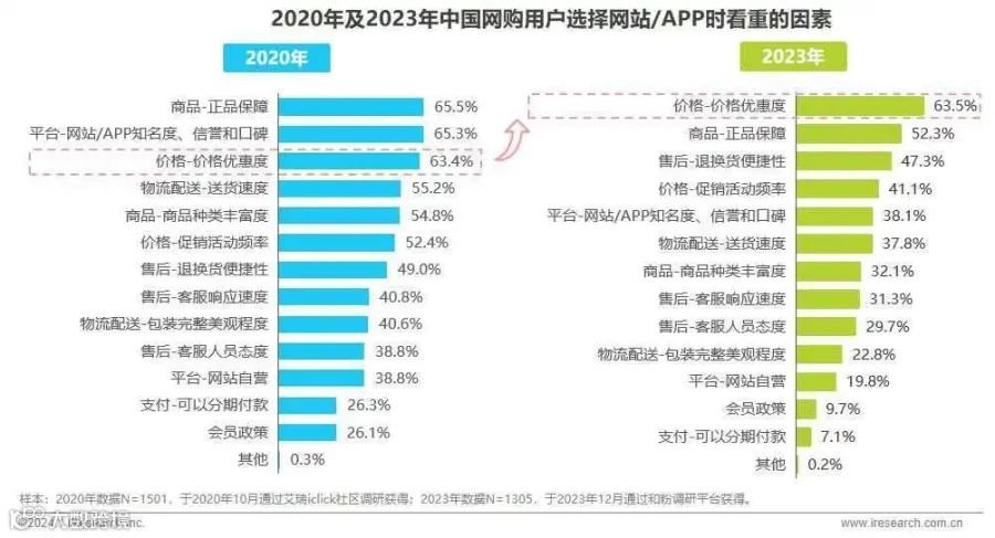 然而,2020年以来,受外部因素影响,中国消费者变得愈发谨慎,开始追求低价商品。艾瑞咨询披露的《2023年中国电商市场研究报告》显示,2023年,中国网购用户选择网站/APP看重的诸多因素中,“价格-价格优惠度”排名第一。