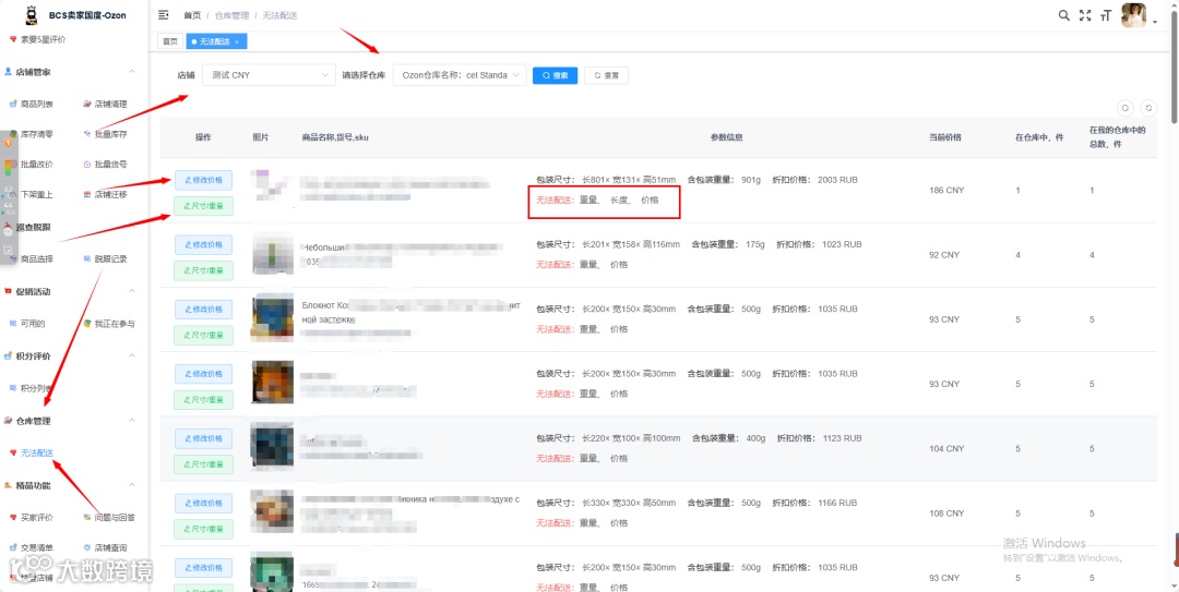 Bcsozon平台在库存管理中新增“无法配送”功能模块,支持用户查询店铺仓库商品列表中所有因物流限制无法配送的商品。