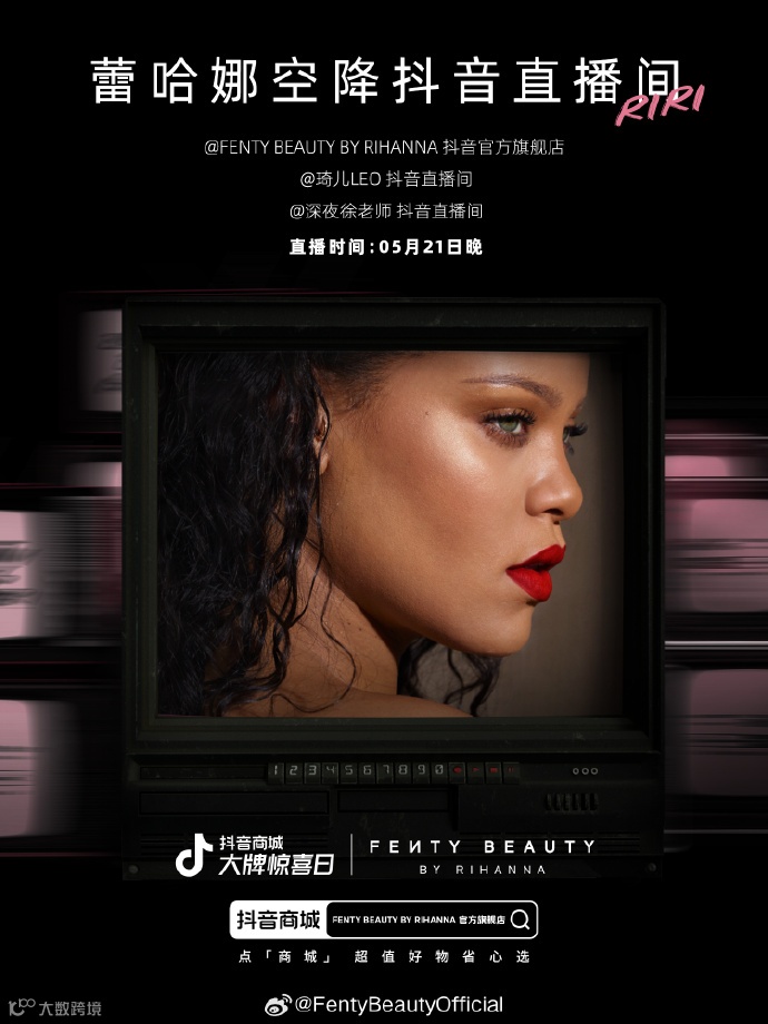 短剧之外,许多美妆品牌还挖掘起短视频之外的新营销场。最近,抖音的“大牌惊喜日”将美妆的线下快闪和体验服务作为主要内容放在线上传播,通过发酵娱乐话题为店铺引流。蕾哈娜来上海为其主理的彩妆品牌Fenty Beauty宣传,“蕾哈娜为粉丝摊煎饼、学中文”等词条在抖音站内总曝光量超过10亿,目前Fenty Beauty的抖音官方旗舰店销量已接近7万。