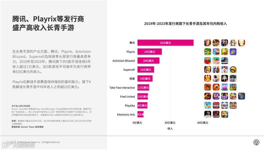 图:Sensor Tower发布报告《2023年全球年收入超1亿美元的长青手游特征与趋势》,报告统计了2019年至今全球手游市场82款连续5年全球收入超1亿美元的热门产品
