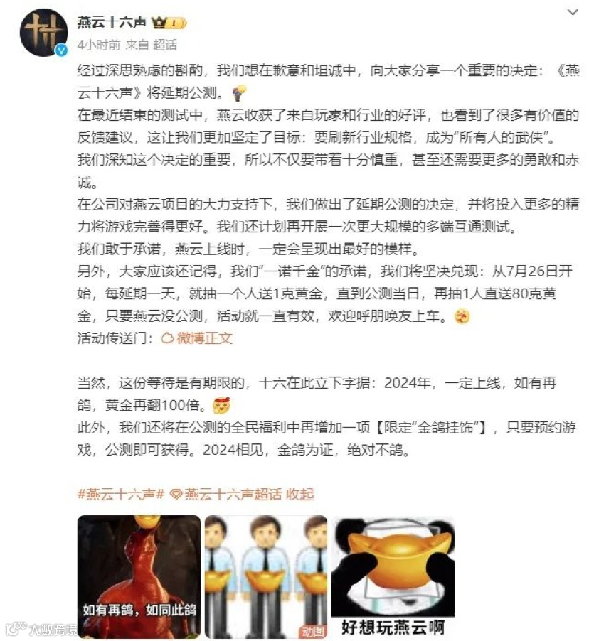图:《燕云十六声》宣布延期,且每延期一天官方微博都要抽一个粉丝送一克黄金