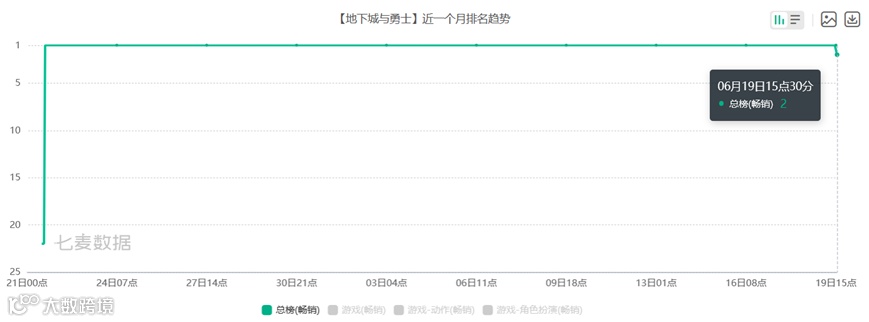 图:DNF手游以直角型的走势持续称霸畅销总榜29天,直至被《崩坏:星穹铁道》赶下冠军王座