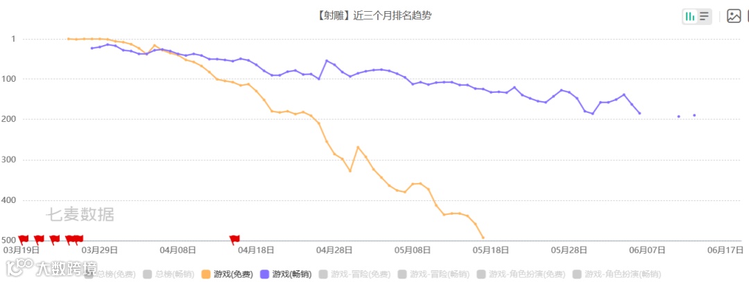 《射雕》在游戏圈掀起的商战无疑为其宣发攒足了热度,而游戏也选择在纪念金庸先生百年诞辰的不久后的3月28日公测上线,结果没料到遭遇了滑铁卢。《射雕》在畅销榜最高只排在第十五位,而在一个多月后就掉至百位开外。据第三方数据,《射雕》首月流水勉强过亿,这个数据可以说是非常之差的。