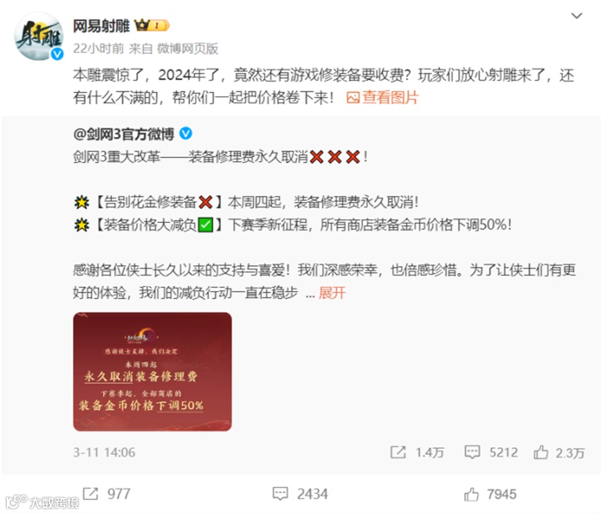 而在营销层面,《射雕》的市场团队更是将网易一贯以来所擅长的与同行互撕的打法发挥到极致,首先是趁着竞品《剑网3》于3月11日发博宣布正式取消装备修理费而登上热搜第二位时,官方微博亲自下场贴脸嘲讽Diss:震惊了,2024年了,还有游戏修装备要收费?放心来射雕...帮你们把价格卷下来。
