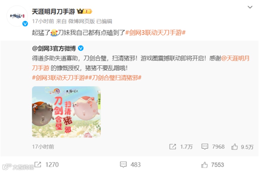 面对着火药味十足的喊话,网易旗下《一梦江湖》与《天下3》先后加入战场发博劝架,其中《天下3》发博宣布全面取消装备修理费,而腾讯旗下的《天涯明月刀手游》与《王者荣耀星之破晓》也加入战场,其中《《剑网3》宣布联动《天涯明月刀手游》,刀剑合璧,扫清猪邪!(“猪”字还特意放大加粗)。一时间,各个产品都喜提一个甚至多个热搜。