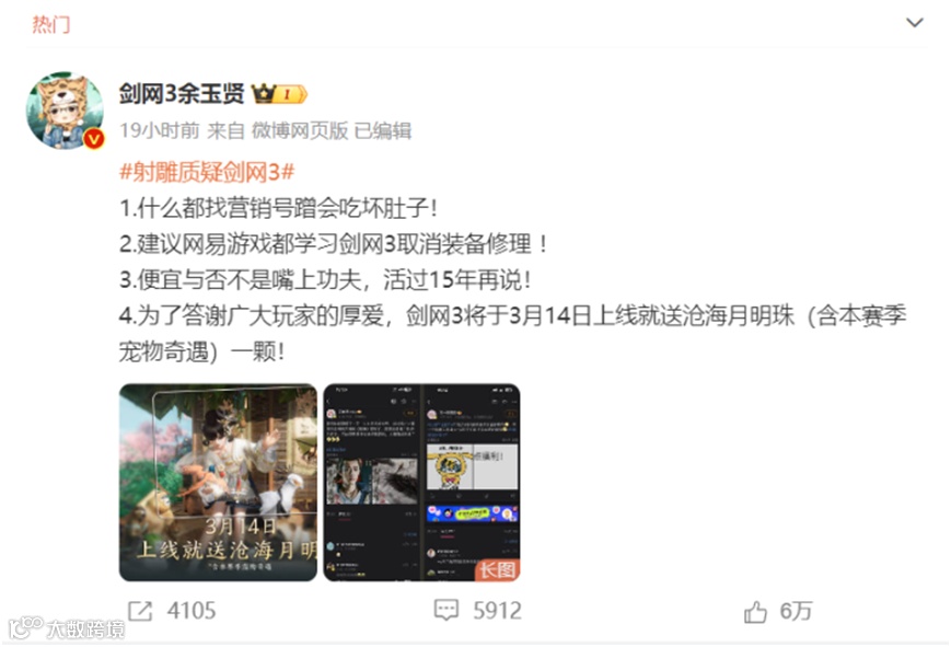 面对网易蹭热度,《剑网3》执行制作人回应《射雕》:别什么都找营销号蹭会吃坏肚子!便宜与否不是嘴上功夫、活过15年再说!