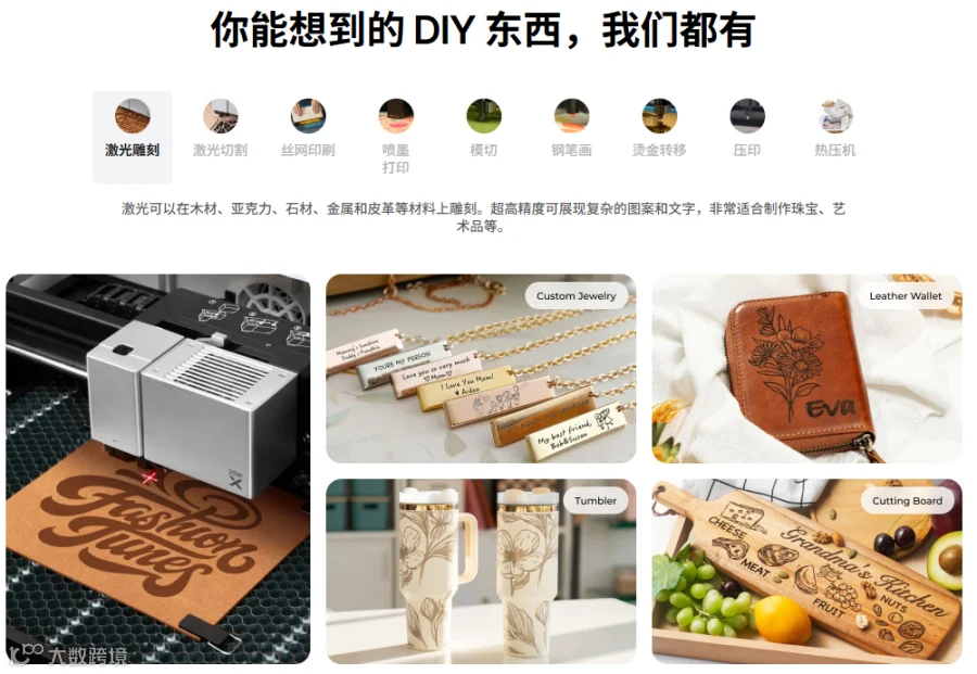 图源:xTool●场景革命:P2系列将工业级CO2激光器微型化,使家庭用户可加工门板、家具组件等大型物件,拓宽应用边界;