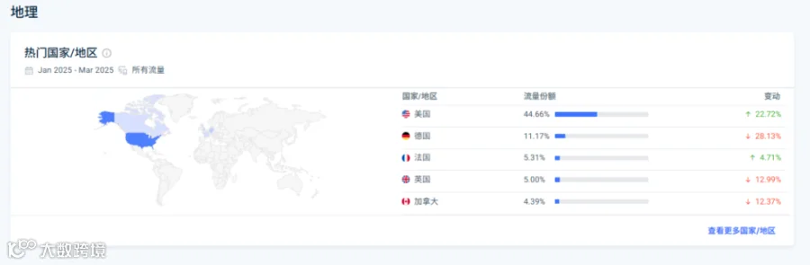 美国以44.66%的流量份额占据主导地位,且流量同比上升22.72%,显示出其在该市场的强劲表现。