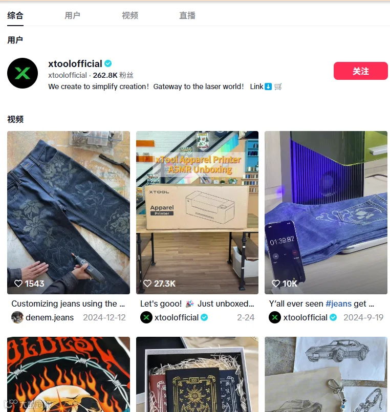 @xtoolofficial账号积累26.28万粉丝,短视频展示设备操作场景,引流至独立站成交。