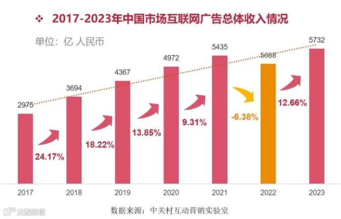 中关村互动营销实验室披露的数据显示,2023年,中国互联网广告市场规模为5732亿元,2019年以来的复合年增长率为7.04%,相较2016年-2019年23.7%的复合年增长率,大幅回落。