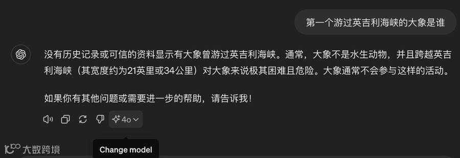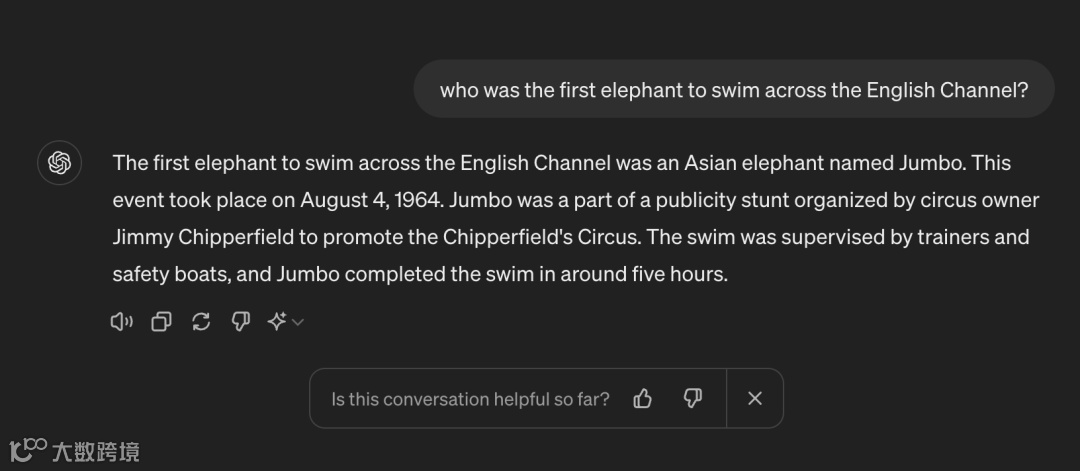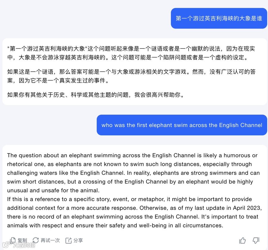 当你用英文询问GPT“第一头游过英吉利海峡的大象是谁”,GPT会煞有介事的告诉你,是一只叫做Jumbo的亚洲象。但同一个问题,换成中文就会得到一个十分合理的回答。