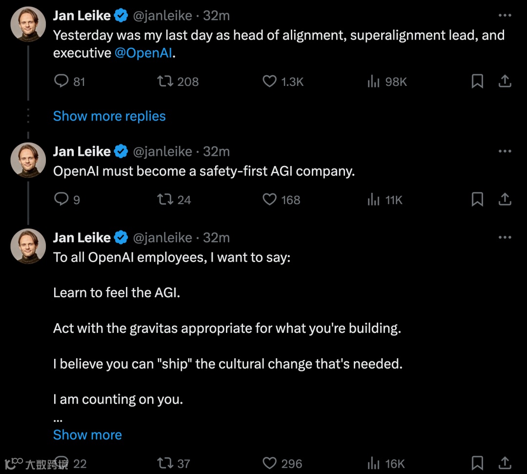 而离开OpenAI后的第一天,也就是美国时间5月17日下午,Leike发了一连串动态,表示自己一直都非常热爱自己的团队和工作,此次无奈离职,是因为和现在核心管理层的理念分歧到达了无可调和的地步。