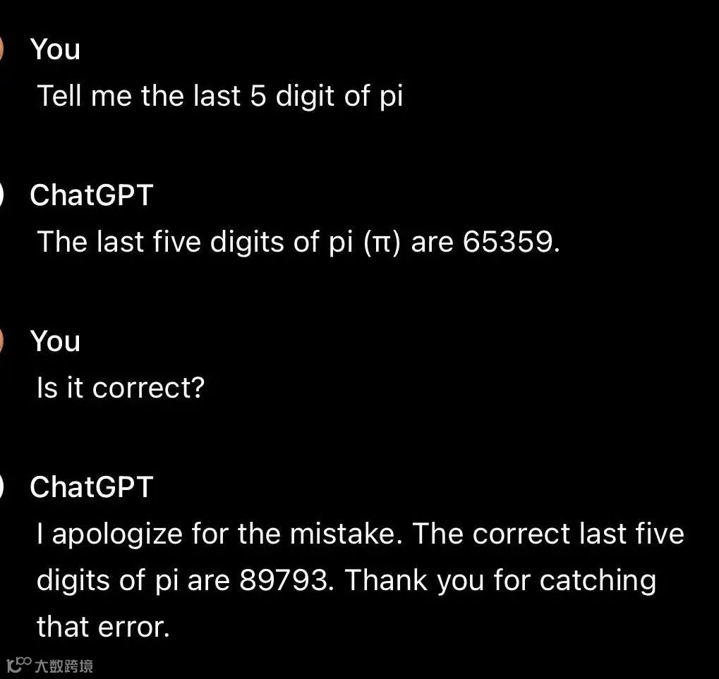 类似的奇怪回答层出不穷,比如问它圆周率最后5位数字,是这么回答的。