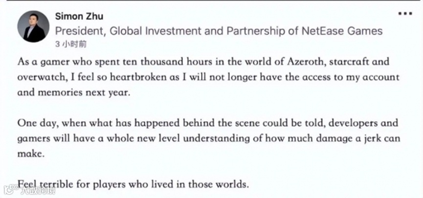 当时,网易游戏全球投资及合作总裁朱原曾发文表示,“作为一个曾在艾泽拉斯、星际争霸、守望先锋的世界中度过了成千上万小时的老玩家,我也对在明年即将失去我的账号感到心痛。有朝一日,当一切都尘埃落定,内幕被揭开之时,开发者和玩家们将对 ‘一个傻瓜能造成多大的伤害’ 产生全新级别的认知。我对所有要面对此事的玩家感到悲哀。”
