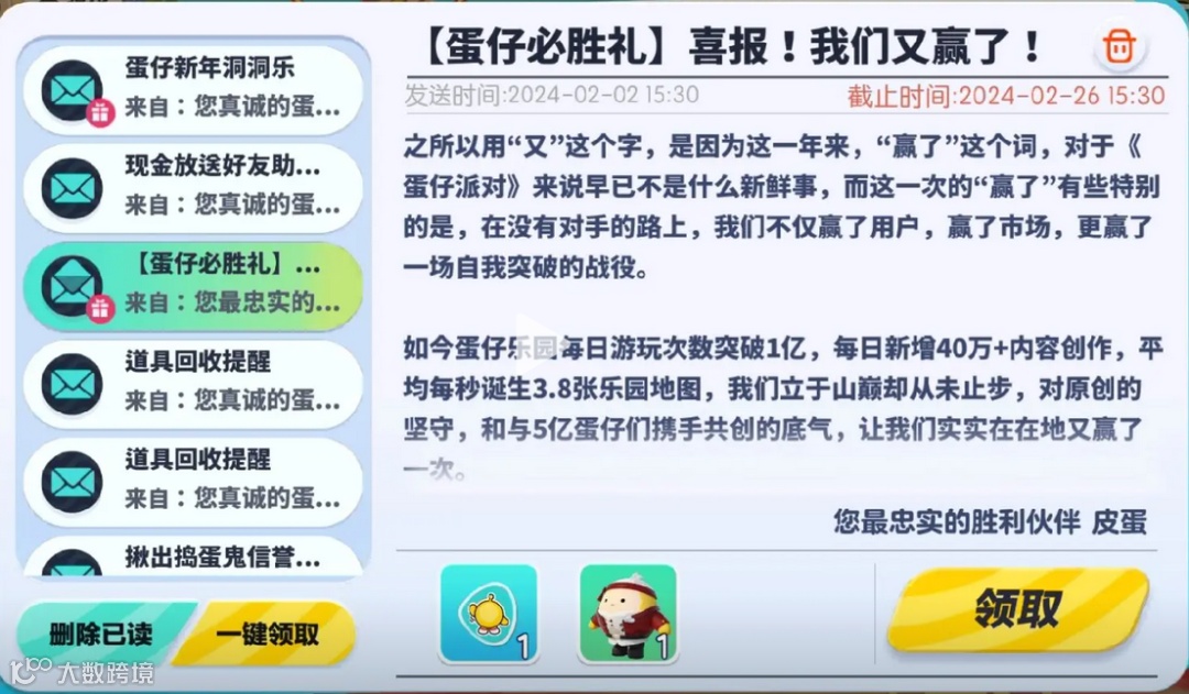 紧接着在2024年2月2日,《蛋仔派对》在游戏中给玩家发送了一封名为【蛋仔必胜礼】的喜报,表示“我们又赢了”,并宣布蛋仔乐园每日游玩次数突破1亿,每日新增40万+内容创作,平均每秒诞生3.8张乐园地图,以及游戏拥有2000万+心怀热爱、志同道合的创作伙伴。