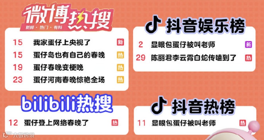 在连续登上三台春晚之后,《蛋仔派对》的确在一定程度上引起了网络主流热度的关注,并带来了破圈效应。据统计,在微博、抖音与B站这三大社交平台上,《蛋仔派对》在春节期间制造的相关热搜就有8条。