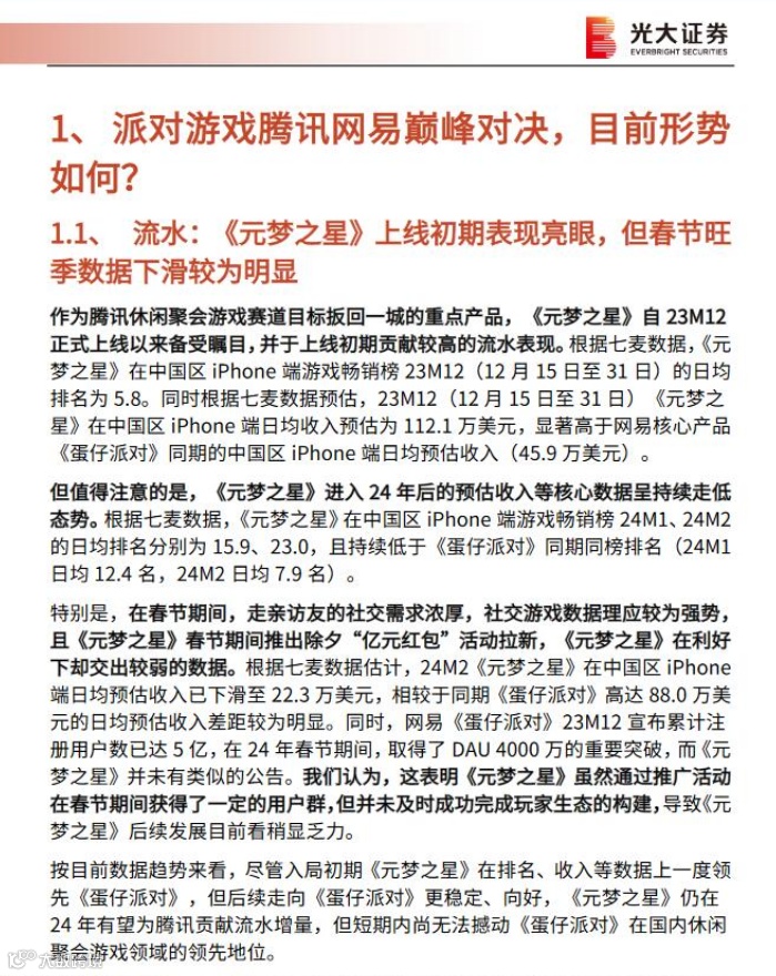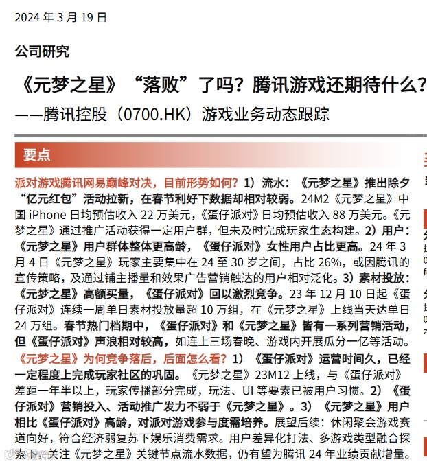 恰好在3月19日,光大证券发布了腾讯游戏业务动态跟踪报告《<元梦之星>“落败”了吗?腾讯游戏还期待什么?》,从中可以窥见券商机构对《元梦之星》的调研情况。