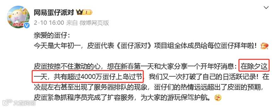 ▲图:网易在大年初一宣布除夕这一天《蛋仔派对》日活超过4000万