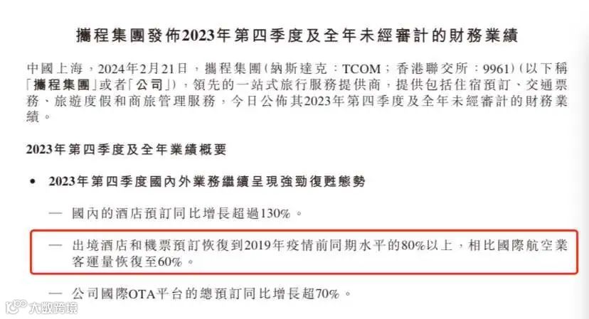 且客观来看,携程目前的复苏还在持续。如其2023年的部分业绩就并未恢复至最高水平,财报中表示,“第四季度,携程出境酒店和机票预订恢复至2019年同期的80%以上,相较之下,国际航空业客运量恢复至60%”。