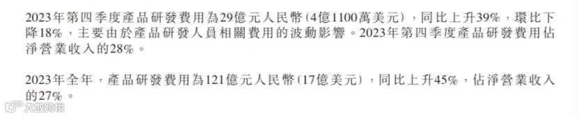 仅2023年第四季度,携程产品研发费用为29亿元,同比上升39%,占当季营收的28%;全年产品研发费用更是达到了惊人的121亿元,同比上升45%,占全年营收的27%。