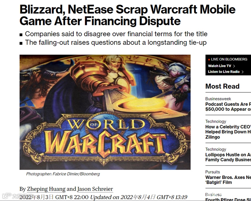▲图:据彭博社报道,暴雪与网易合作的《魔兽世界》MMO手游已经中止开发