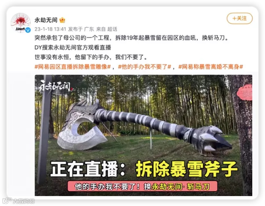 接下来,网易先是推出13(要散)元特饮——“暴雪绿茶”,再就是在《永劫无间》官号上直播拆除暴雪魔兽血吼战斧的雕塑,在宣传效果上都堪称“出圈”。网易的做法,就好比离婚之后立马砸烂当年的定情信物,一时间更坐实了暴雪的“渣男”形象,暴雪进一步陷入负面舆论漩涡。