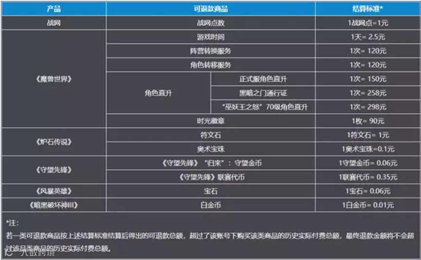 ▲图:网易发布的暴雪游戏相关的“可退款商品”的具体范围及退款标准