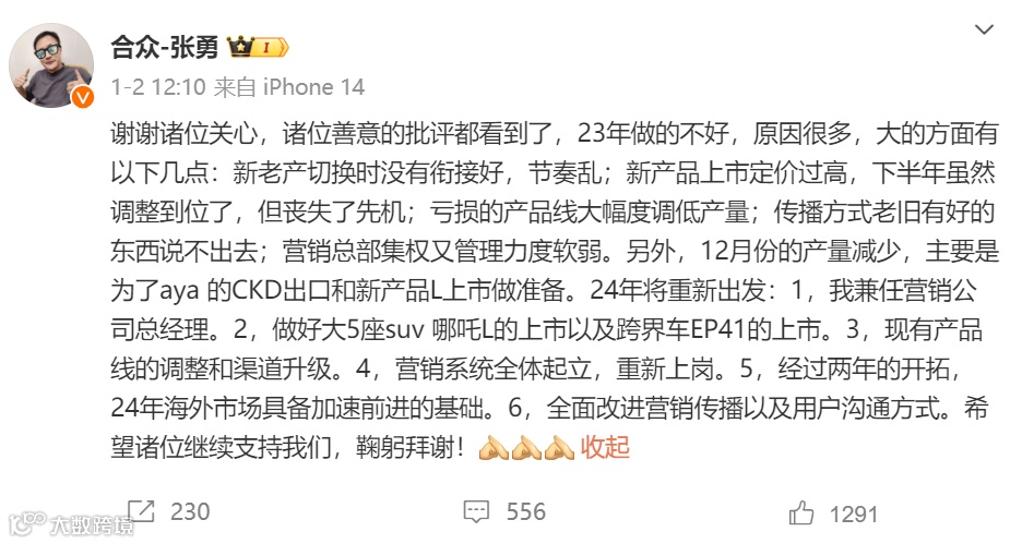 2024年刚开年,哪吒汽车CEO张勇在微博公开检讨“2023年做的不好”,主动提出短板并提出了诸多改进举措,不难看出哪吒汽车在2024年“重新起飞”的决心。