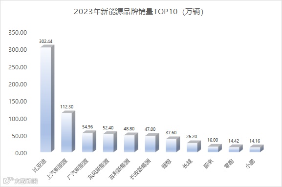 2023年,比亚迪以302.44万辆坐稳榜一位置,与第二名的上汽新能源甩开了190万辆的差距,随后是几家传统车企的新能源品牌,均徘徊在50万量级左右的位置,分别是广汽新能源、东风新能源、吉利新能源以及长安新能源。