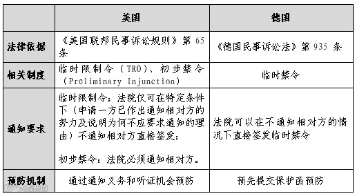 在德国,企业可依据《德国民事诉讼法》第945a条提前向法院提交保护函,使法院在审查禁令申请时参考其立场,避免单方裁定。美国虽无保护函制度,但强调程序通知,被申请人通常有机会参与听证。