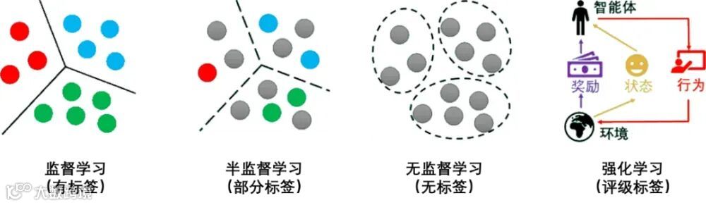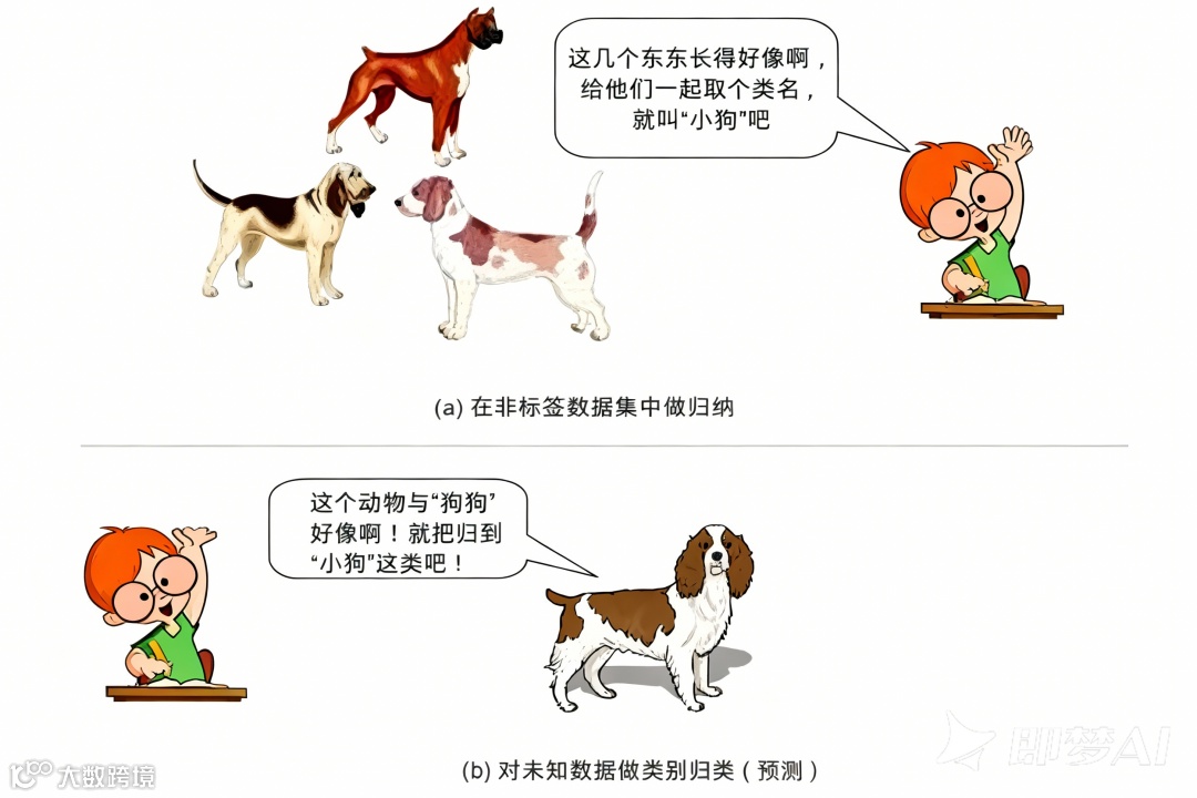 无监督学习(Unsupervised Learning):简单理解为“自学标评”,即没有老师的环境下,学生自己学习,一般有既定标准评价或者无评价。采用聚类方法,学习结果为类别。