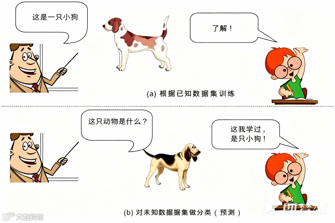 监督学习(Supervised Learning):简单理解为“跟老师学”,即在有老师的环境下,学生从老师那里获得做对或做错的反馈。其学习结果为函数,以概率函数、代数函数或人工神经网络为函数模型。