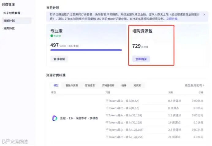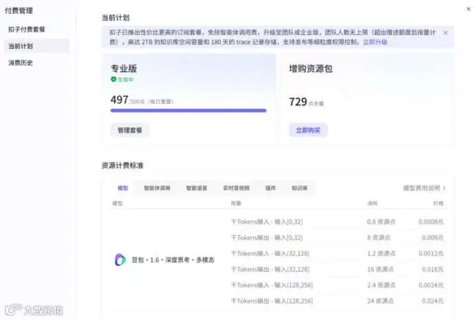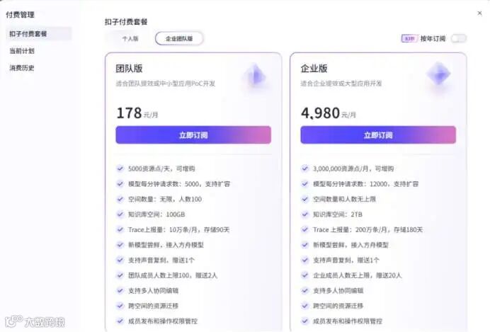 不同参考权益对比:https://www.coze.cn/premium 大家关联我们的伙伴账号,开通团队版或企业版,享受95折优惠,大额充值可以帮申请代金券