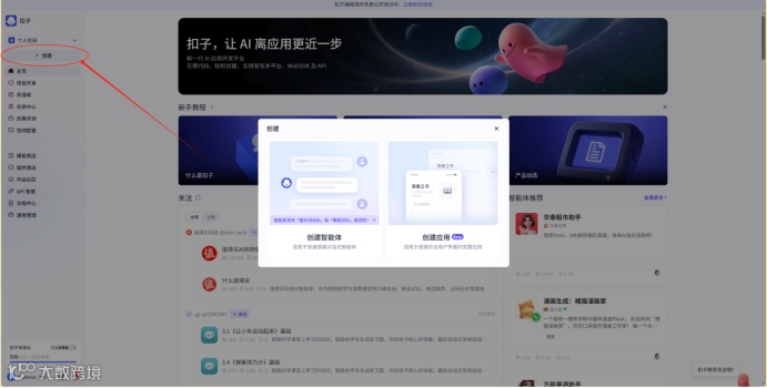 创建Coze智能体或Coze应用的主入口,左上角有个“创建”按钮