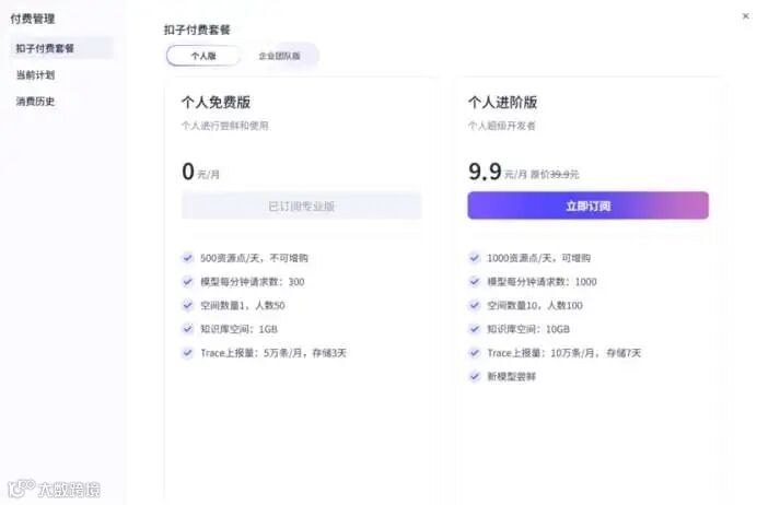 1、刚开始学习,开通哪个版本的套餐? 一般个人免费版够用,每天500资源点,如果用超了,等第二天重置资源点。 如果不想等,可以考虑开通个人进阶版,9.9元/月。 如 果开通个人进阶版,资源点还是偶尔会超,可以考虑增购资源包,10元购买1万资源点