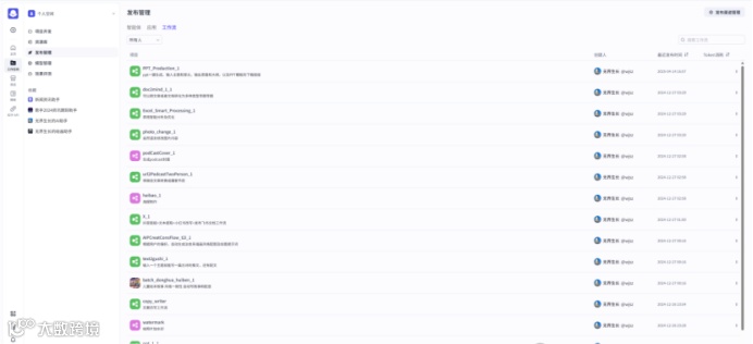 支持查看工作流相关的信息,比如工作流名称、创建人、最近发布时间、Token消耗等