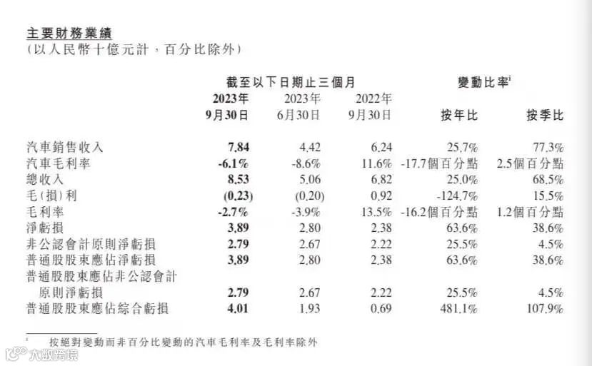第三季度财报可见,小鹏汽车2022年同期亏损为23.8亿元。因此,相当于小鹏汽车第三季度净亏损同比增加63.6%、环比增加38.6%,净利润呈亏损持续扩大的趋势。
