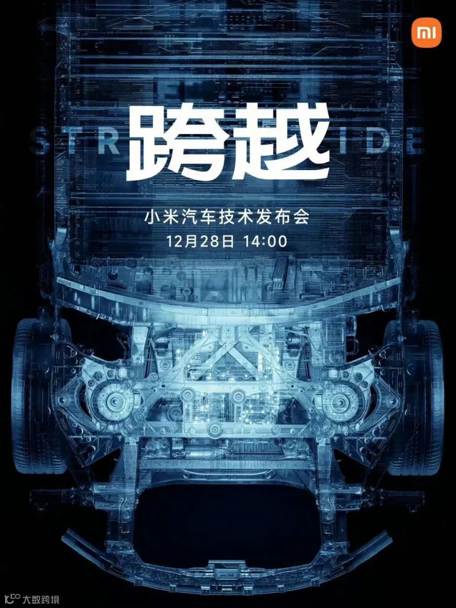 而12月25日,小米创办人、董事长兼CEO雷军在个人社交账号发文称:小米汽车技术发布会将于12月28日举办,并表示这次只发技术,不发产品。同时配了一张以汽车底盘为背景的预告图,预告主题为“跨越”。