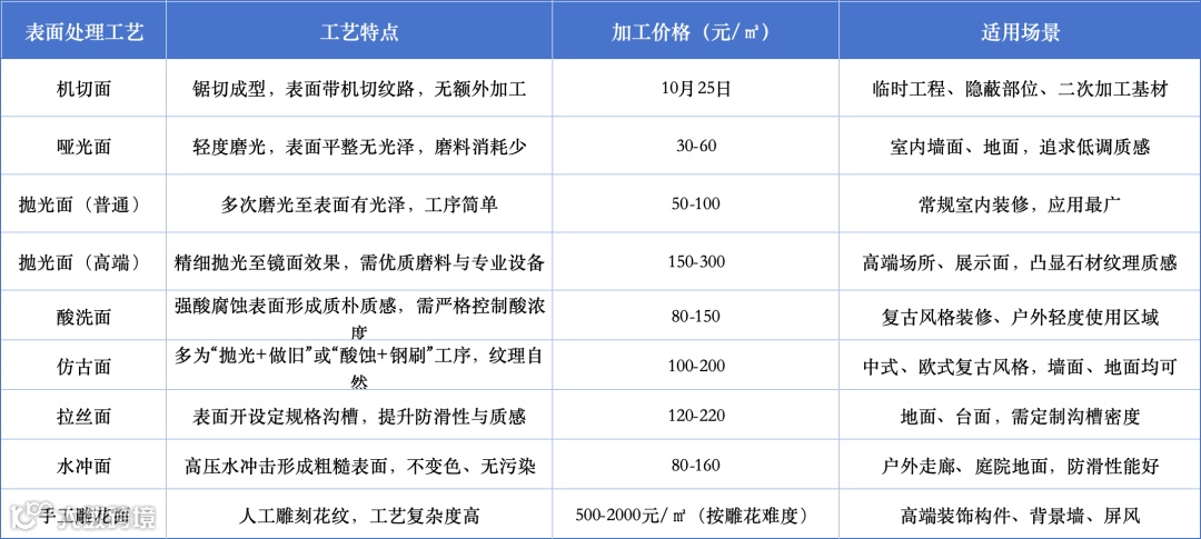 常见表面处理工艺包括抛光面、哑光面、仿古面等,高端工艺有酸洗面、拉丝面、水冲面等。工艺价格区间在10–300 元/㎡,价差主要来源于加工精度、工序复杂度以及人工投入。