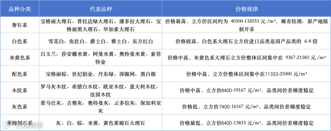 品类的层级直接决定了价格的梯度。奢石系列的立方价格远高于其他品类;白色系进口大理石的价格通常是国产同类产品的 6–8 倍。其他品类(如米黄色系、配色系等)价格依次递减。在同一品类内,不同细分品种之间的价差相对稳定。