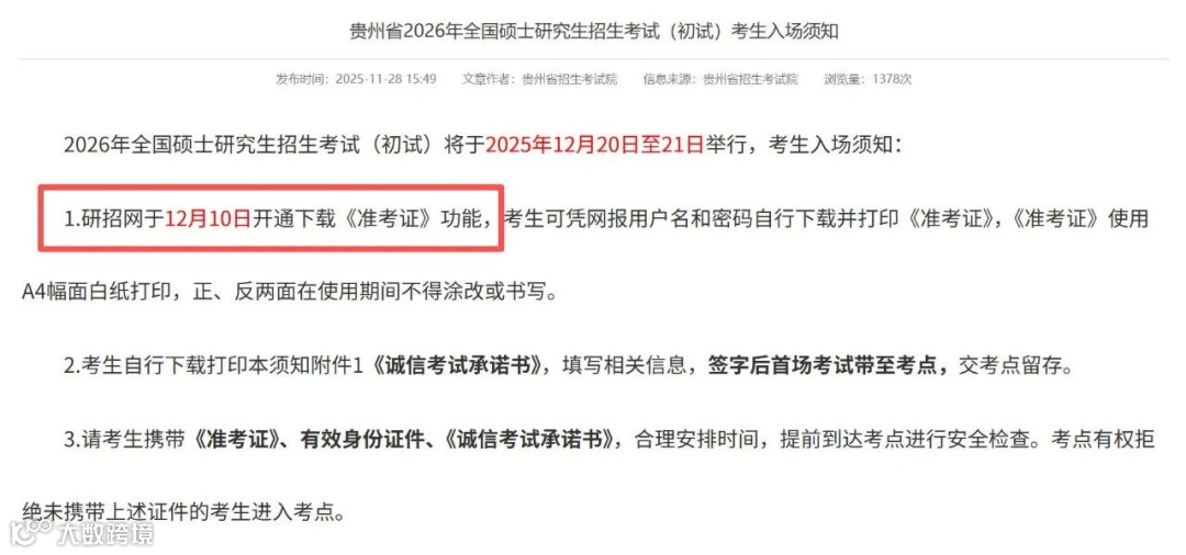 最近,贵州省招生考试院已经正式公布了准考证的下载开放时间12月10日。