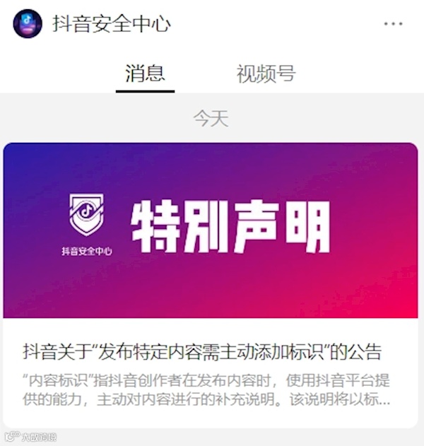 据快科技9月8日消息,抖音发布关于“发布特定内容需主动添加标识”的公告[1],强调创作者应尊重事实、发布客观真实信息,同时对于特殊类型的内容,必须通过“内容标识”提供充分说明。