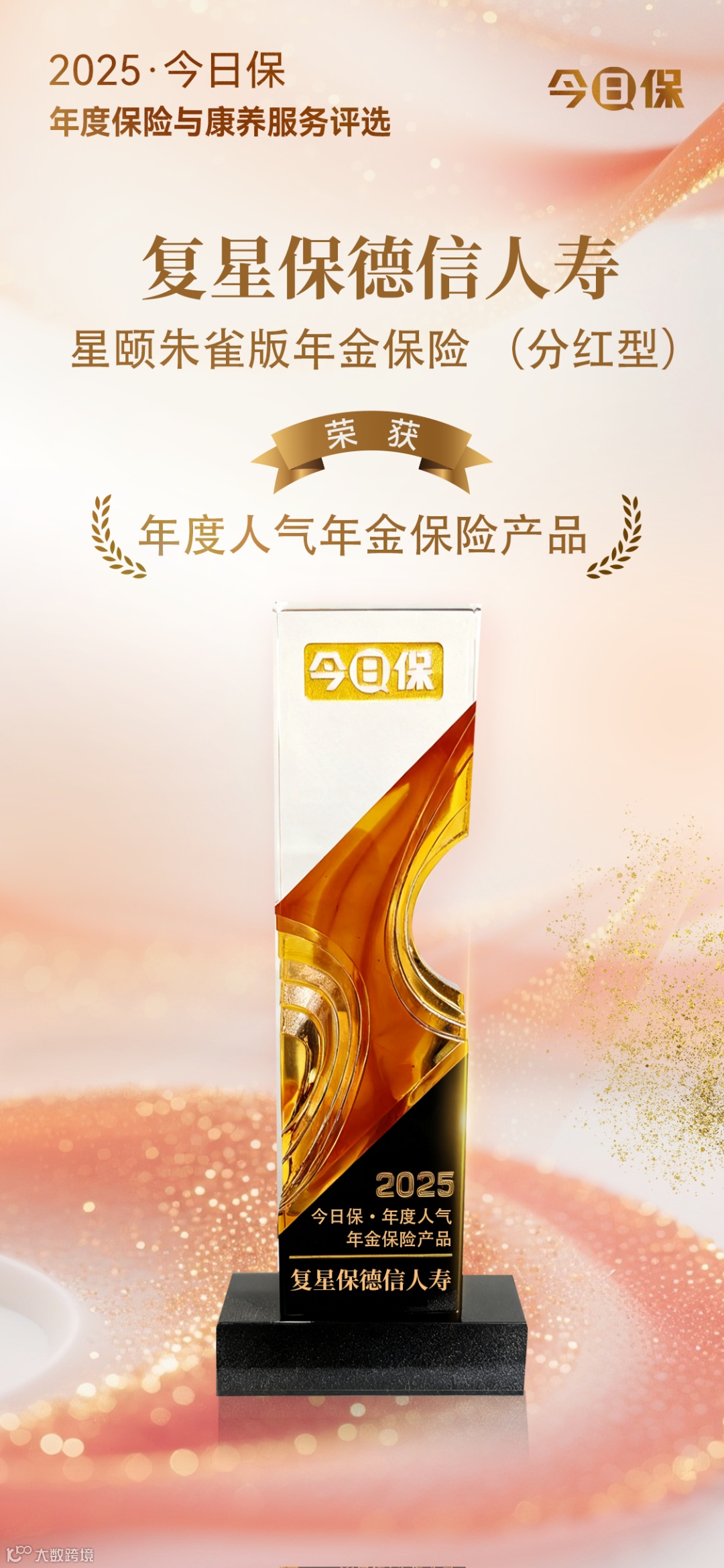近日,在由《今日保》《今日保研究院》联合发起的“2025·今日保年度保险康养人气榜”评选中,复星保德信人寿旗下的“星颐朱雀版年金保险(分红型)”凭借卓越的市场表现与创新的产品设计,成功入选榜单,荣获“年度人气年金保险产品”。