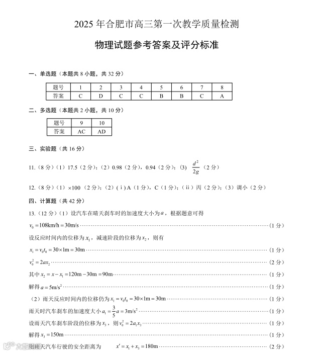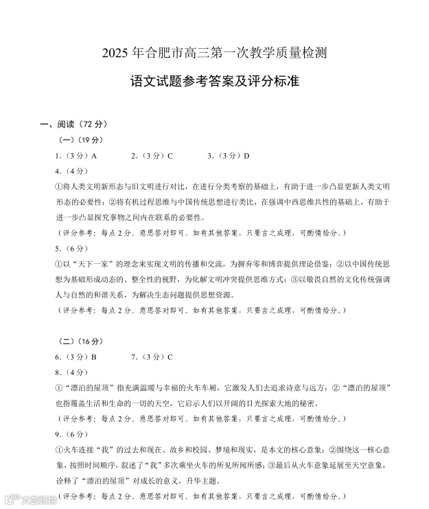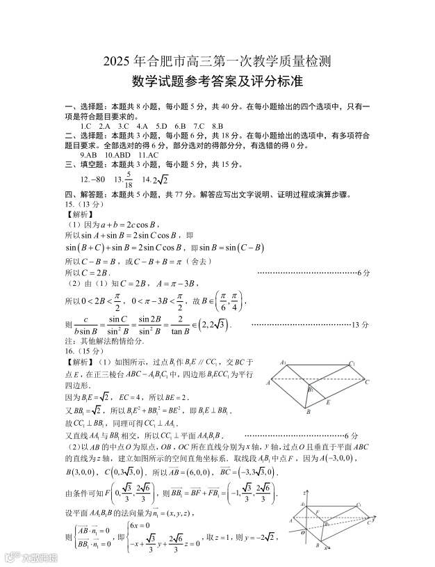 2025届高三合肥一模部分答案预览