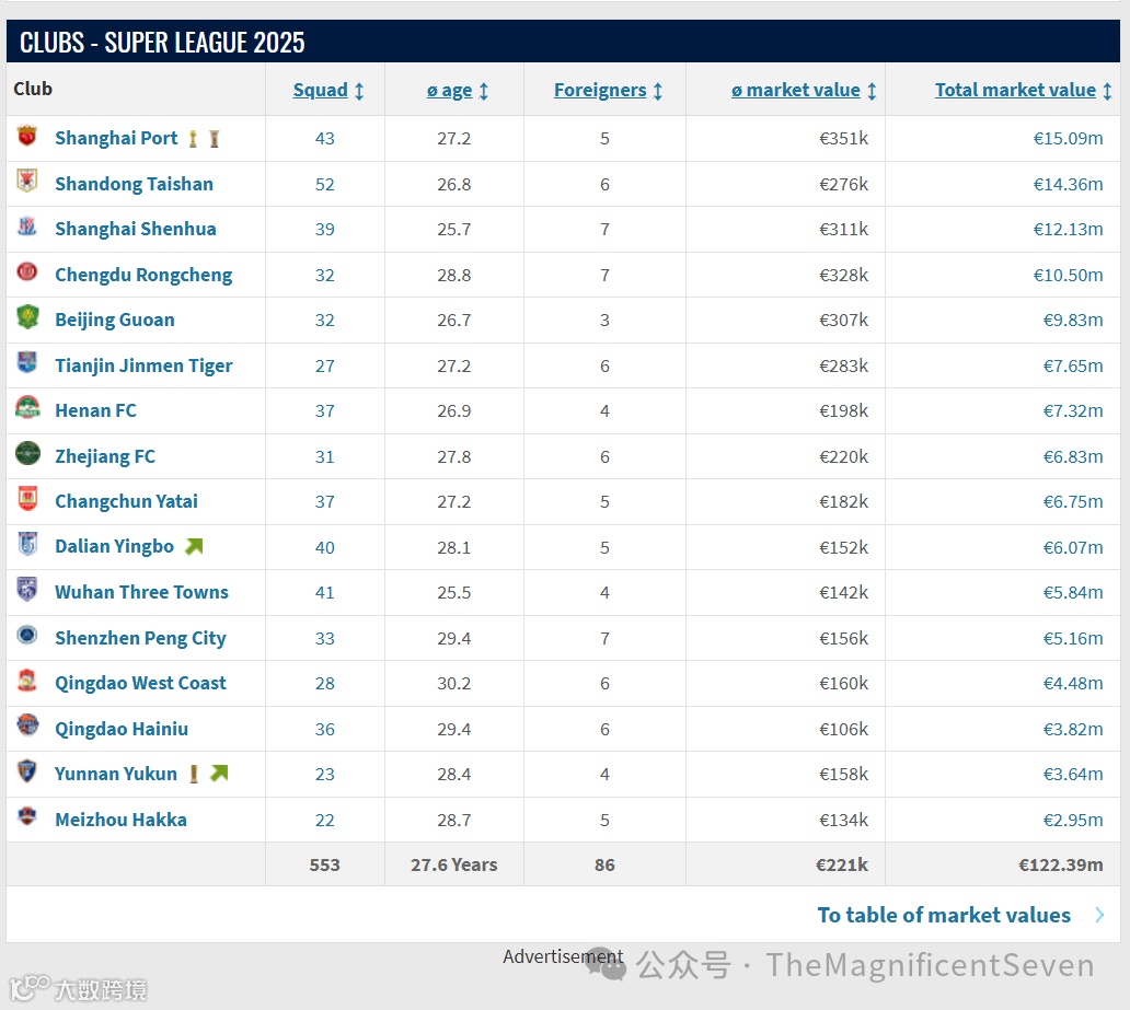随着新援加入,上海海港全队总身价升至1509万欧元,跃居2025赛季中超球队身价榜首,领先同城对手上海申花296万欧元。作为对比,本赛季中超升班马云南玉昆全队身价仅为363万欧元,凸显海港投入力度之大。
