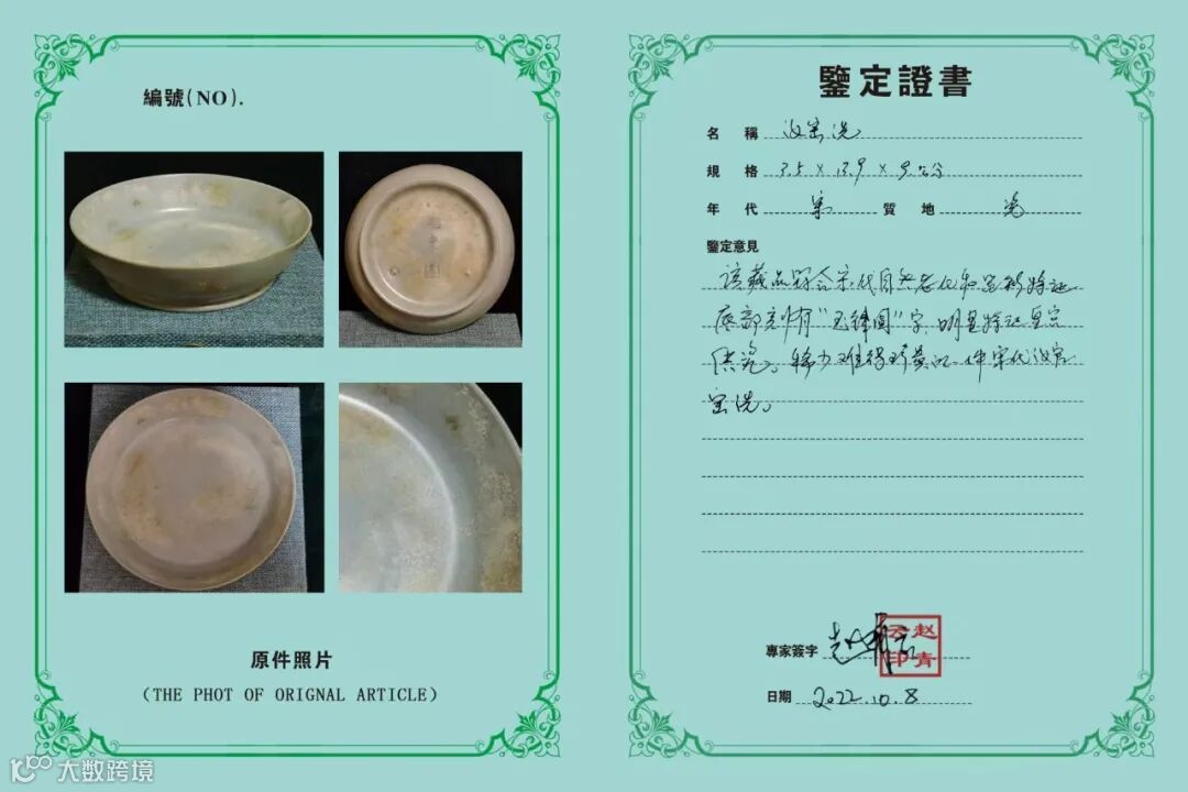 鉴定者赵青云,1932年生,河南省文物考古研究所研究员、原副所长,河南古陶瓷研究会会长,河南省文物鉴定委员,中国古陶瓷学会副秘书长 。深耕古陶瓷考古鉴定70余年,是汝瓷与钧瓷研究泰斗,解决宋汝官窑、钧窑窑口历史悬案。