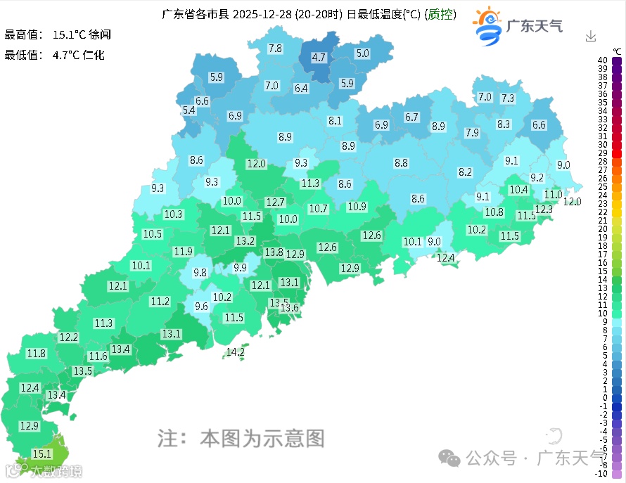 据“广东天气”消息,12月28日早晨,梅州东北部市县最低气温较12月27日下降1℃—3℃,其余大部分市县大致持平或上升1℃—2℃。具体分布:粤北大部、珠三角北部和粤东北部市县介于6℃—10℃,珠三角南部和粤西沿海市县介于12℃—15℃,其余大部分市县介于10℃—12℃,其中韶关仁化录得全省最低气温4.7℃。