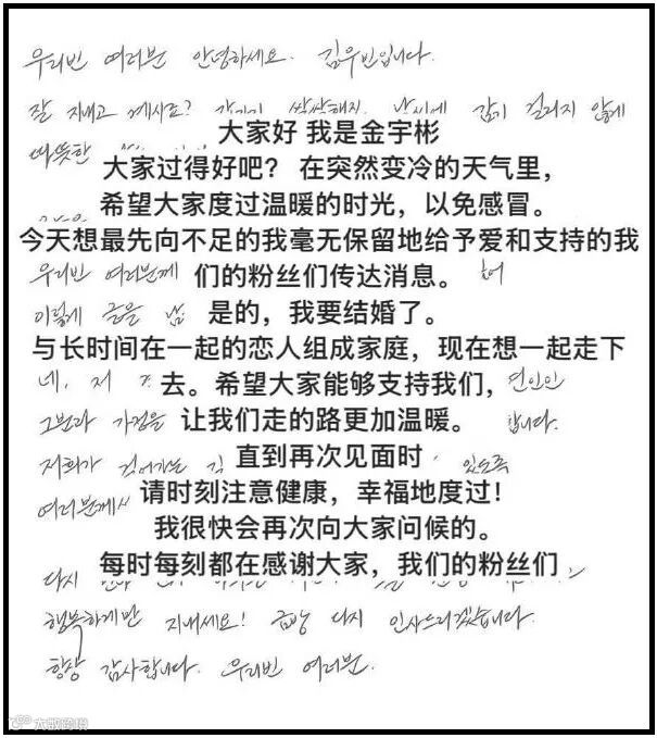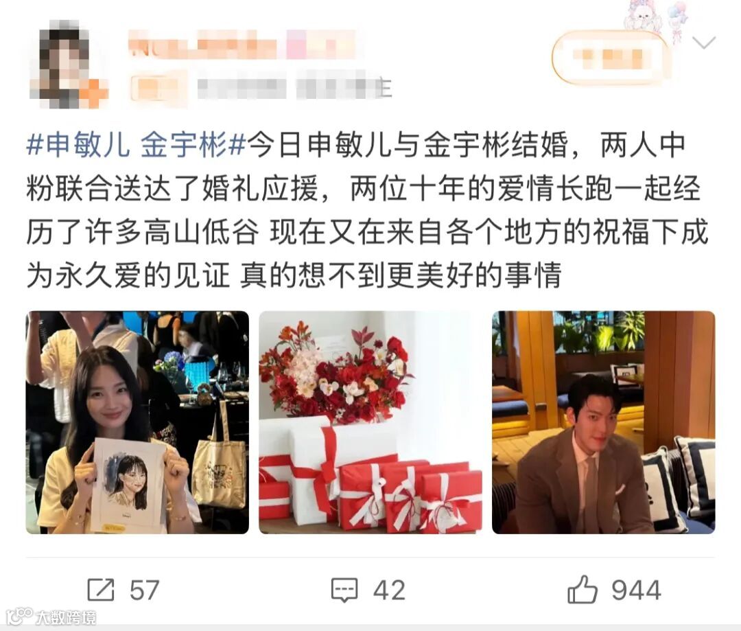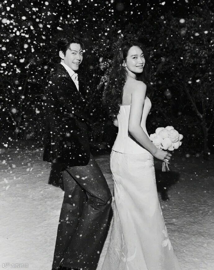 公司公开两人的婚纱照,申敏儿一袭白裙,手拿捧花,金宇彬西装革履,两人在雪地中牵着手回眸。此外,