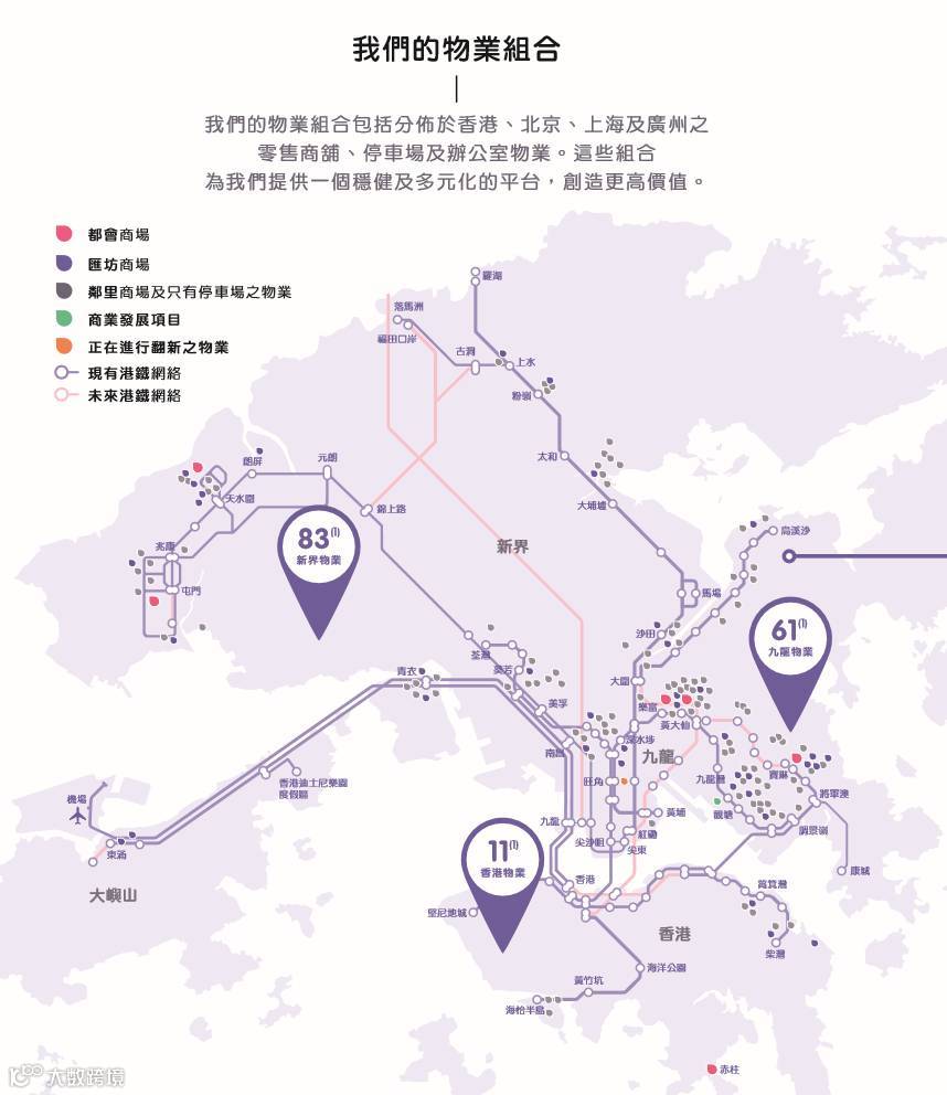 与内地商场多依附写字楼不同,领展旗下物业集中于香港居民社区周边,涵盖餐饮、鲜活市场、超市、理发、医疗及儿童游乐等民生业态,构成居民衣食住行的基本保障。目前,领展在港运营约180个商业项目,服务近40%香港人口,受益范围因毗邻地铁和公交枢纽而进一步扩大,实际覆盖超50%市民日常消费需求。其持有商业物业总楼面面积约1100万平方尺(约122.22万平方米),占全港零售物业总面积的9%。